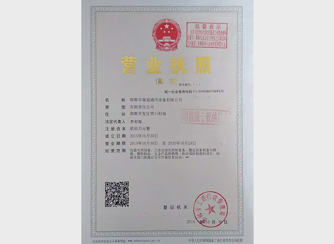 邯鄲市瑞冠智能化裝備有限公司辦公室地址位于具有1萬年的歷史和3100年的建城史的邯鄲,邯鄲 邯鄲開發區賈口村南,于2015-10-30 在邯鄲工商局注冊成立,注冊資本為200萬人民幣(萬元),公司已經公司發展壯大的5年,愿與社會各界同仁攜手合作,謀求共同發展,繼續為新老客戶提供優秀的產品和服務。我公司主要經營包裝專用設備、工業自動化控制設備、搬運設備制造與銷售;塑料制品、五金產品的銷售(依法須經批準的項目,經相關部門批準后方可開展經營活動),我公司與多家邯鄲零售商和代理商建立了長期穩定的合作關系,品種齊全、價格合理,企業實力雄厚,重信用、守合同、保證產品質量,以多品種經營特色和薄利多銷的原則,…